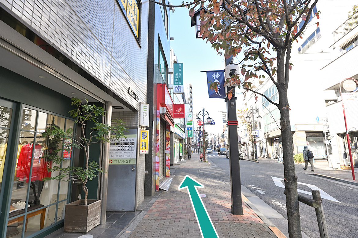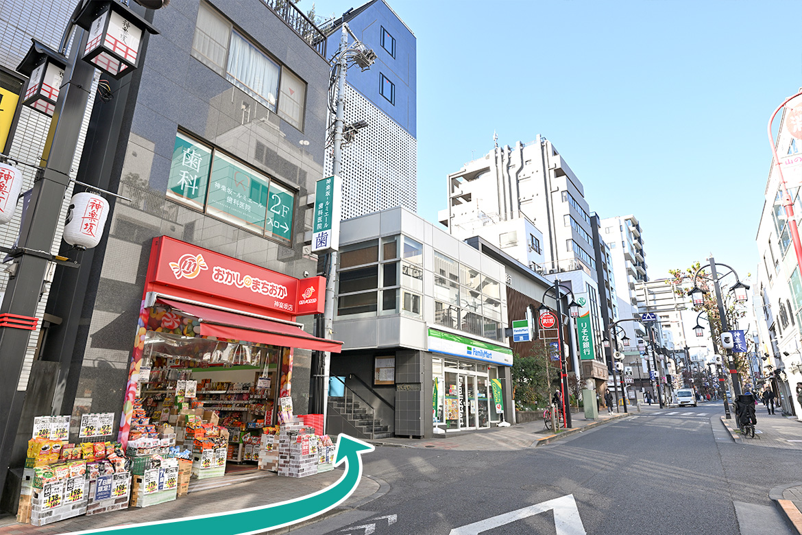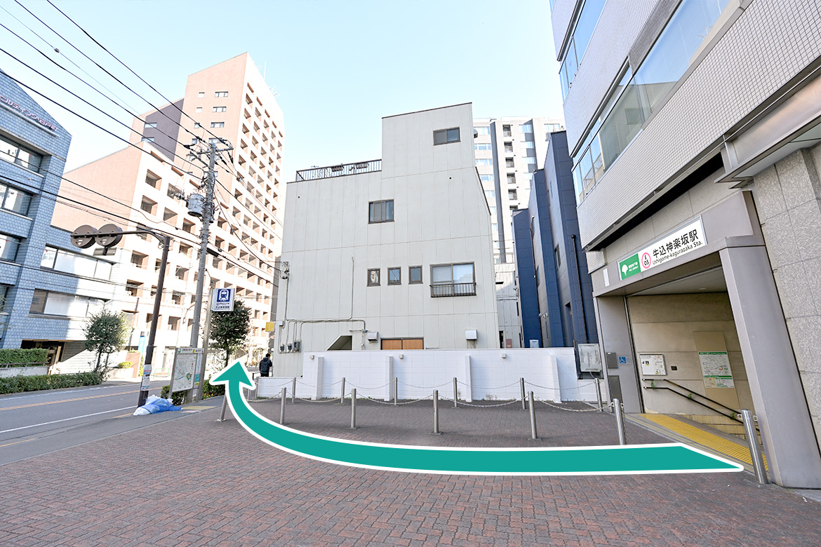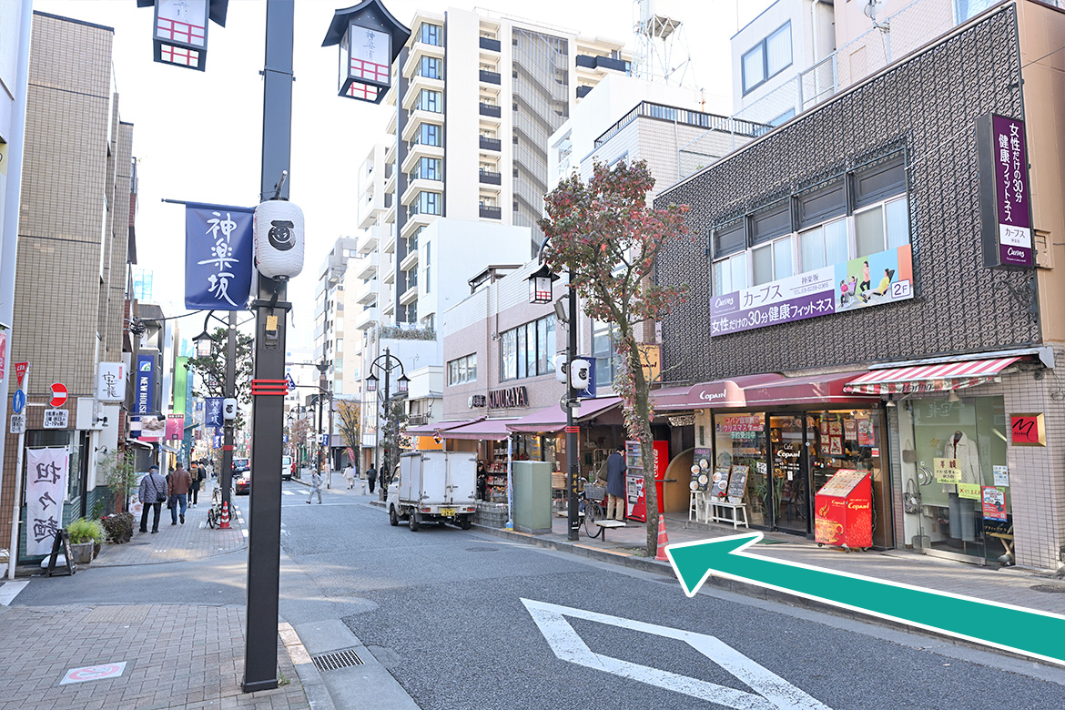 牛込神楽坂駅A3出口から矢印方面へ進みます