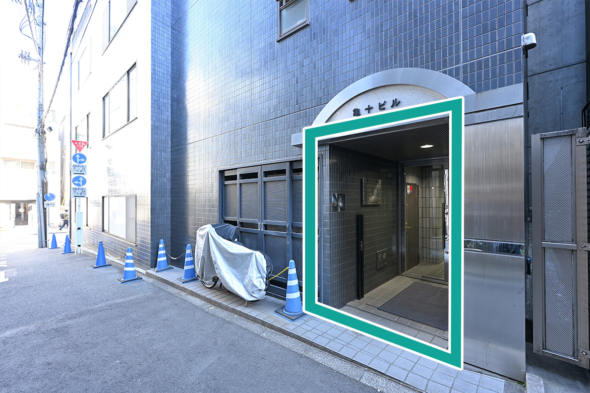 入り口は、こちらです。エレベータがありますので、2Fへお上がりください