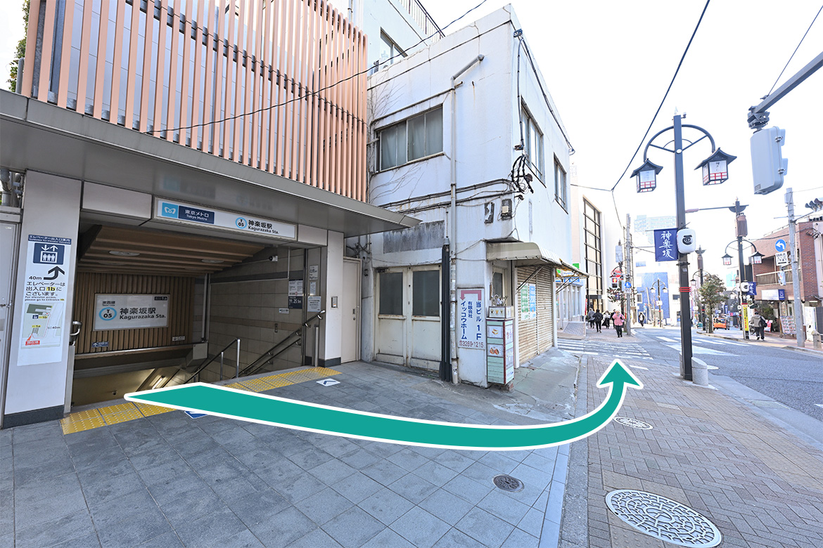 神楽坂駅1a出口から矢印方面へ進みます。